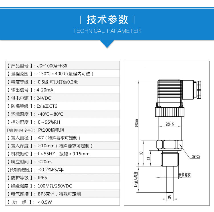 小巧型溫度變送器產品采用PT100作為信號測量元件,并通過計算機自動測試,用激光調阻工藝進行了寬溫度范圍的零點和靈敏度溫度補償。放大電路位于不銹鋼殼體內,將傳感器信號轉化為標準輸出信號4-20mA(可定制RS485),充分發揮了傳感器的技術優勢,使JC-1000系列溫度變送器具有優異的性能。它抗干擾、過載、溫度漂移小、穩定性高,具有很高的測量精度,是工業自動化領域理想的溫度測量儀表。